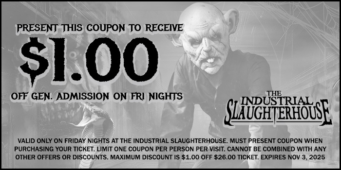 PLEASE NOTE: On BLACKOUT nights, the lights will be turned off and your group will be given a single glowstick to find your way through, as the Slaughterhouse will be filled with the undead. If you wish to experience the attraction normally, please plan your visit for a Friday or Saturday.